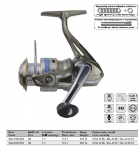 AQUA SPIN 30FD 7+1BB MISTRALL с передним фрикционом, а так же с 7-ю подшипниками в механизме и одним в ролике лескоукладователя. Компьютерная балансировка ротора, алюминиевая ручка. Ролик и шестерни сделаны из нержавеющей стали. В комплекте с графитовой шпулей.