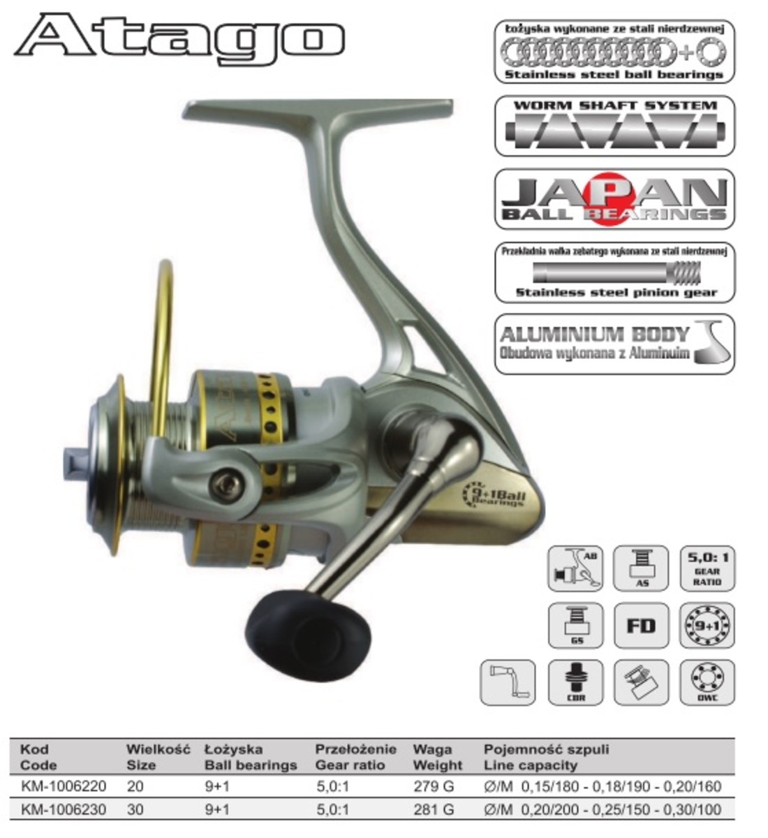 Топовая рыболовная катушка Mistrall ATAGO подойдёт для многих видов рыбной ловли, но чаще всего применяют эту катушку для ловли спиннингом. В этом Польском продукте фирмы Mistrall использованы все последние технологии: облегчённый металлический корпус и ротор, японские керамические подшипники, компьютерная балансировка ротора, система "антивибрация", установлена система качественной намотки шнура, которая защищает шнур/леску от "бороды".