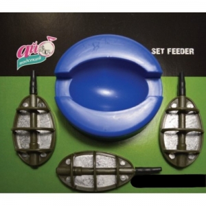 Набор состоит из трех кормушек разного веса,оптимально подобранных для разных условий лова и одной жесткой пластиковой пресс формой(специальное устройство для набивки прикормкой флэт кормушек)