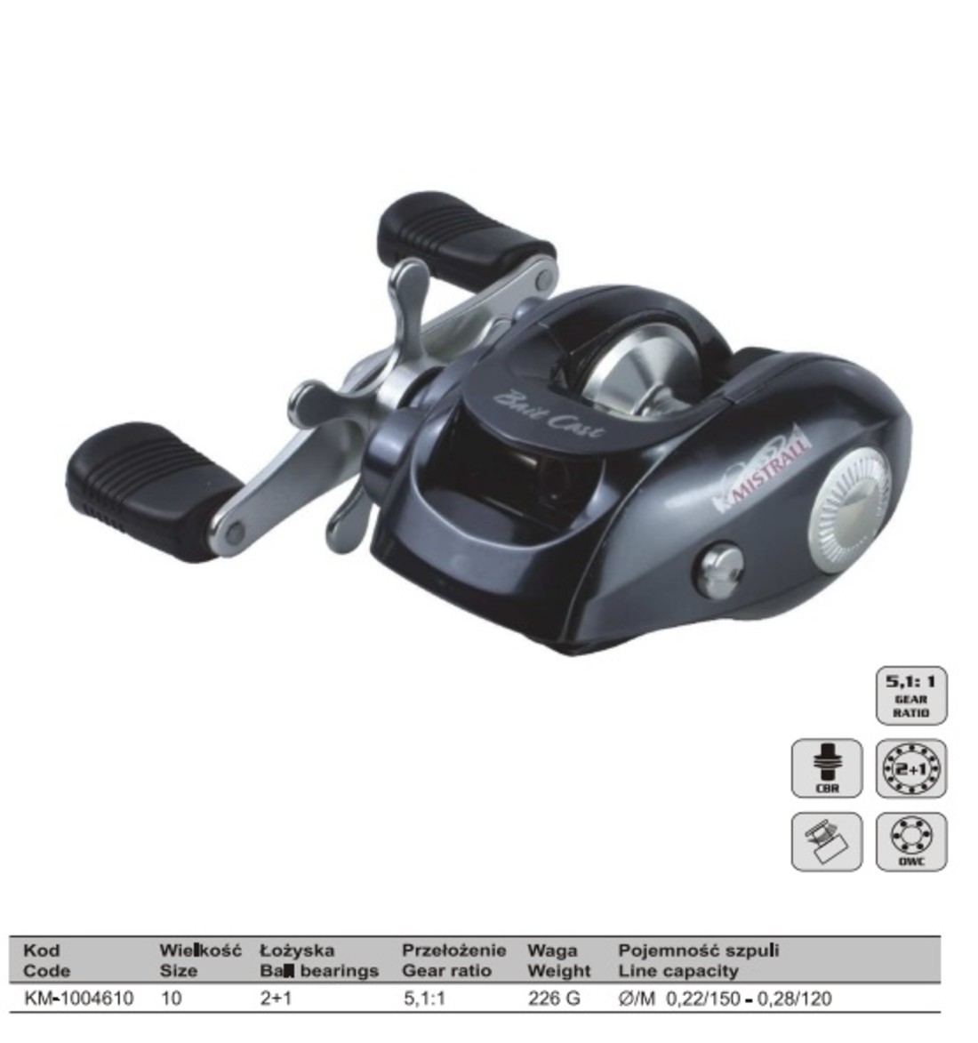 BAIT CAST 100 MISTRALL - лёгкая,хорошо сбалансированная,недорогая низкопрофильная мультипликаторная катушка с двумя подшипниками и алюминиевой шпулей.